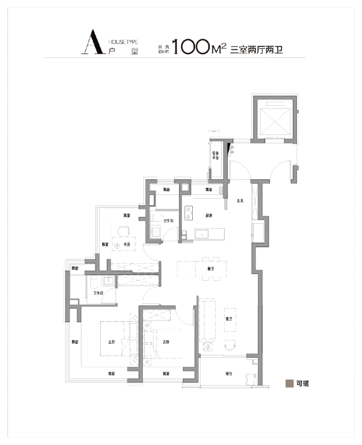 100㎡户型,双270°飘窗设计(南向主卧+北向书房),南次卧、厨房、双卫飘窗,厨房烟道外移,飘窗配置抽屉,极致空间利用率.